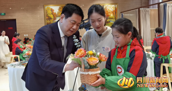在蜀徽酒店一楼研学课堂,苏华与德阳外国语小学五年级的孩子们交流花艺心得,并希望孩子们通过研学课堂掌握一些生活技能,陶冶尚美的情操。这堂由德阳外国语学校、四川省德阳市旅游职业学校共同探索实施的“德阳外国语学校研学实践综合课程”,是德阳职业教育与普通教育之间交流融通的缩影。
